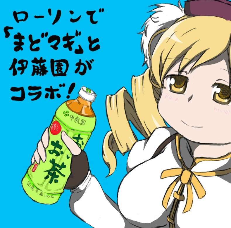 ローソンで伊藤園商品買うとキャンペーンに応募できるときいてうっかりマミさんに代表商品持たせてみただけの絵。